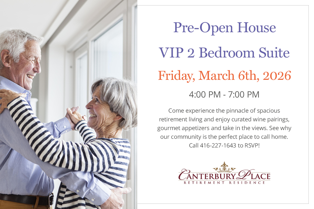 Experience the pinnacle of spacious retirement living at Canterbury Place. We invite you to an intimate preview of our stunning 2-bedroom suite before our public Open House on March 7th.