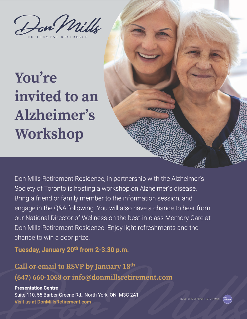 Join us for our Alzheimer’s Workshop at Don Mills Presentation Centre on Tuesday, January 20th from 2-3:30pm.