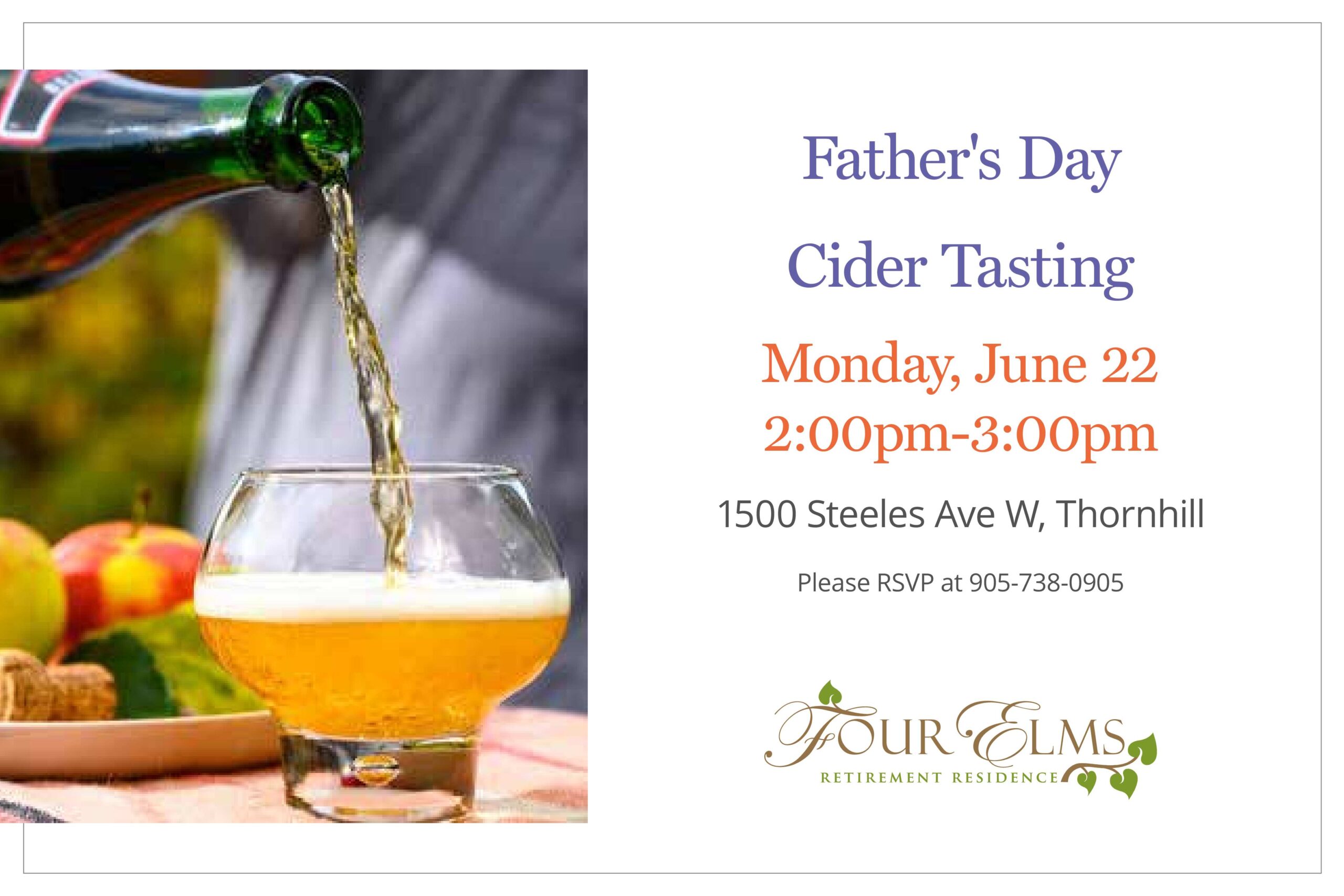 Please join us for a delightful Father’s Day Cider Tasting and Social Afternoon on June 22 from 2:00 – 3:00 PM.
