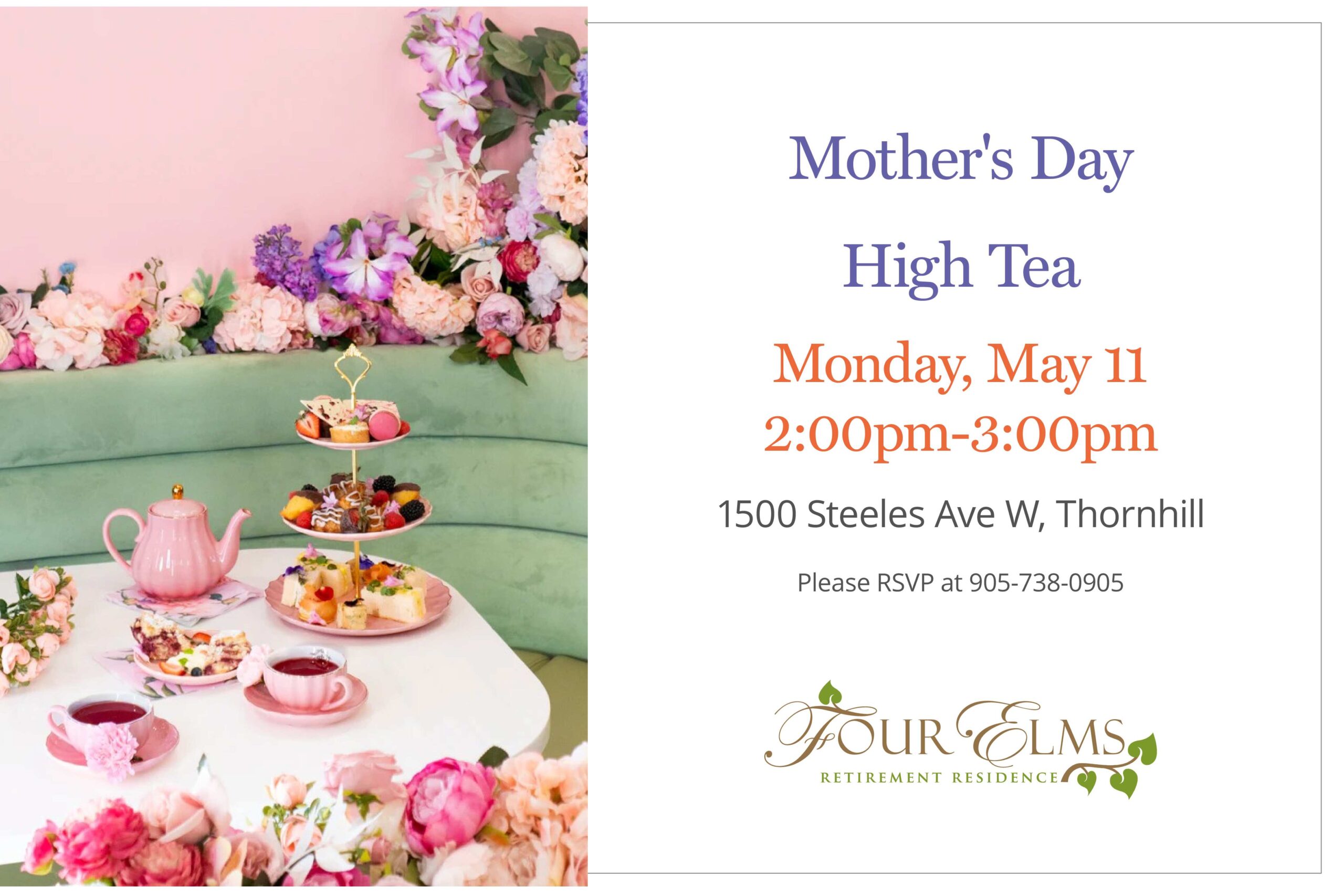 Celebrate Mother’s Day with an elegant afternoon of High Tea, sweet treats, and special moments on May 11, 2026 from 2:00 – 3:00 PM.