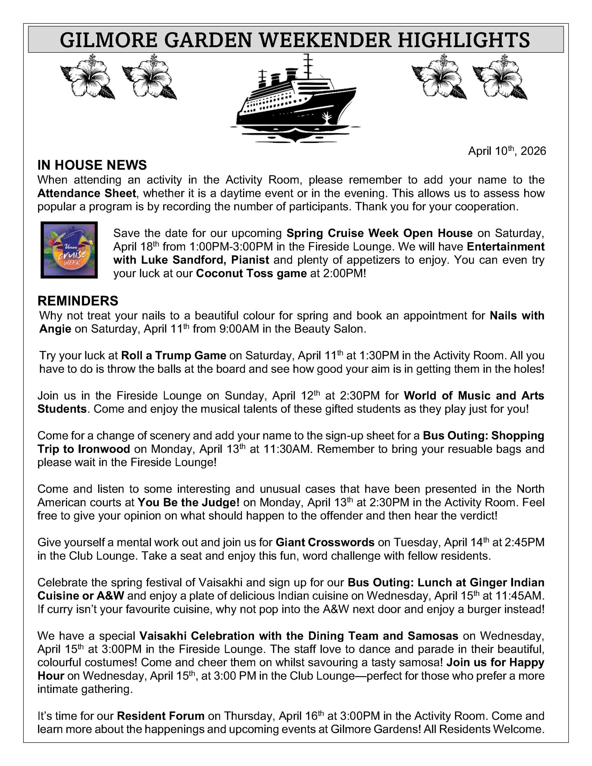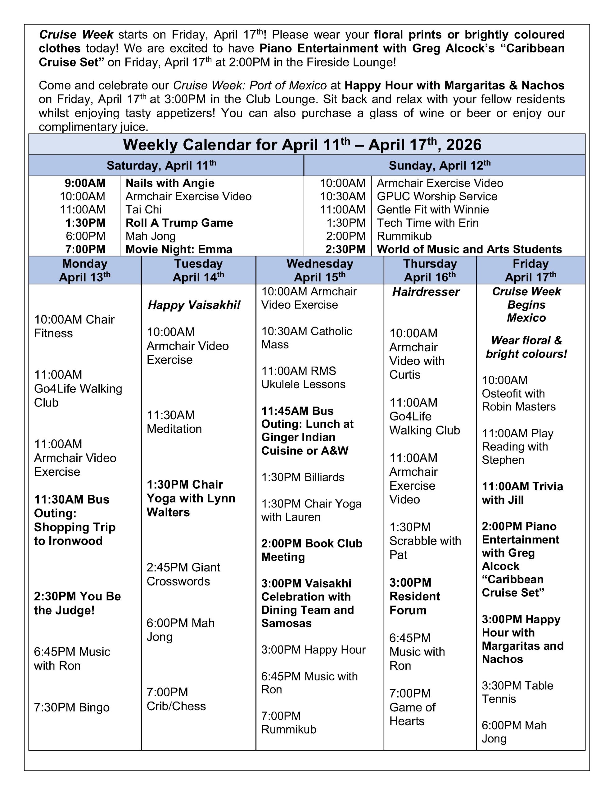April 11th to 17th, 2026 – Weekly Activity Calendar