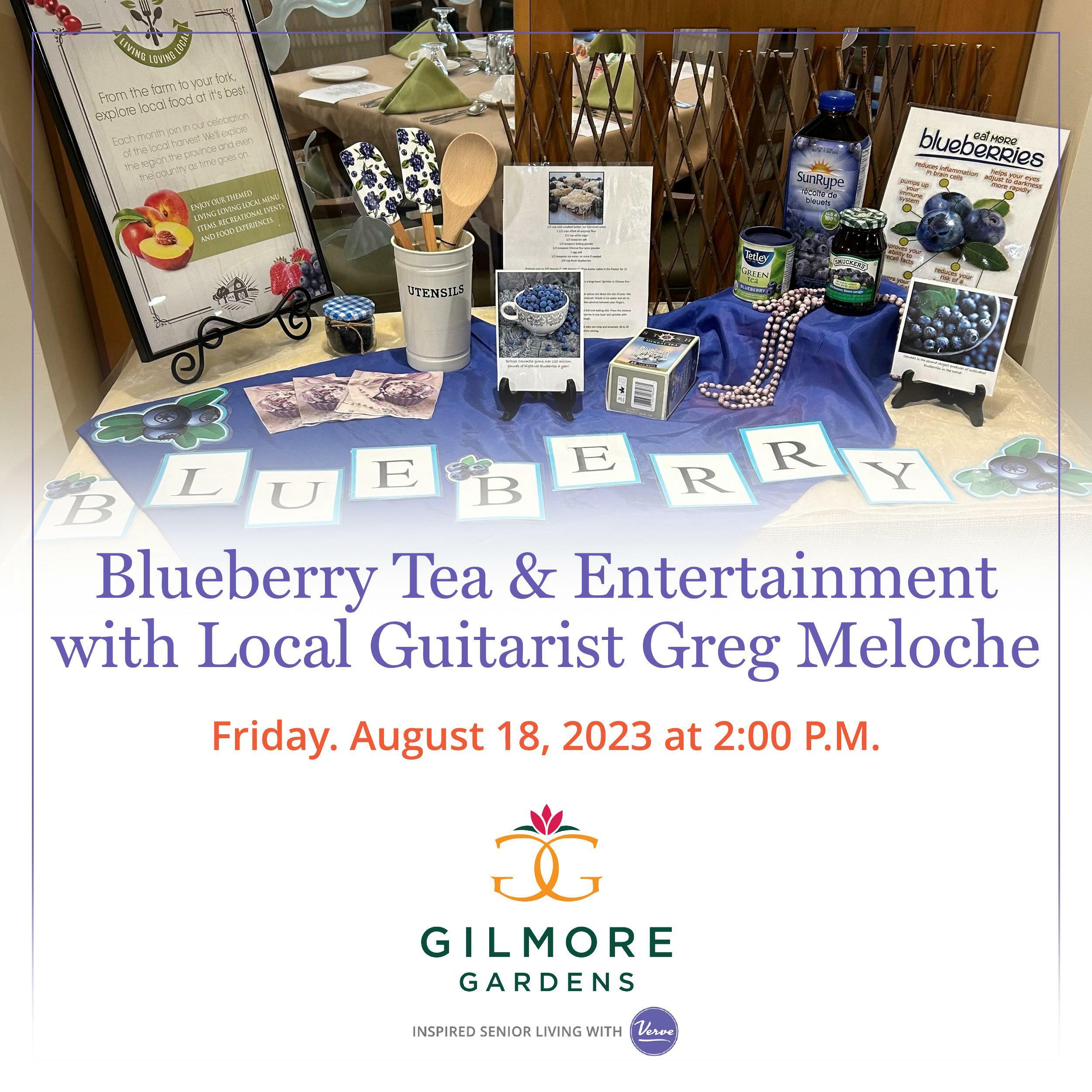 Don’t miss this amazing opportunity to join us for a Blueberry Tea on Friday, August 18 at 2 pm! You’ll get to experience our wonderful community, savor delicious Blueberry refreshments and listen to the talented local guitarist Greg Meloche.