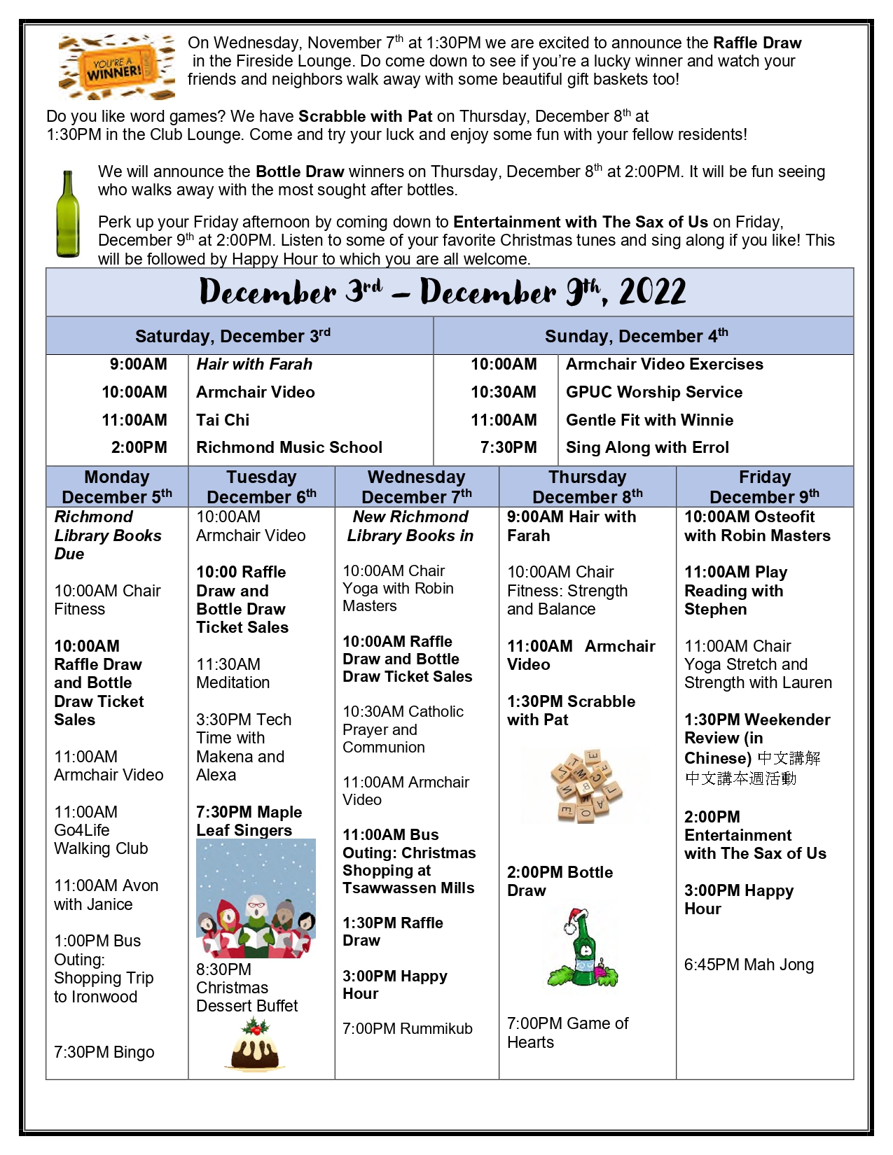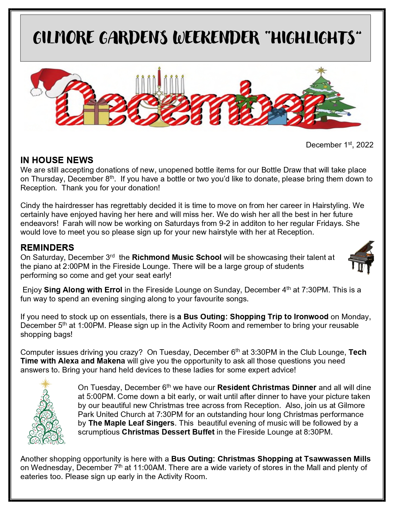 Come see what’s going on for the week December 3rd– December 9th at Gilmore Gardens.