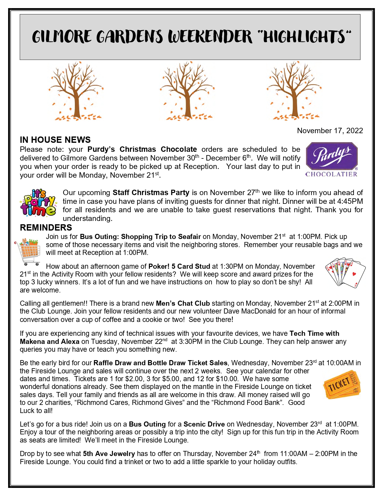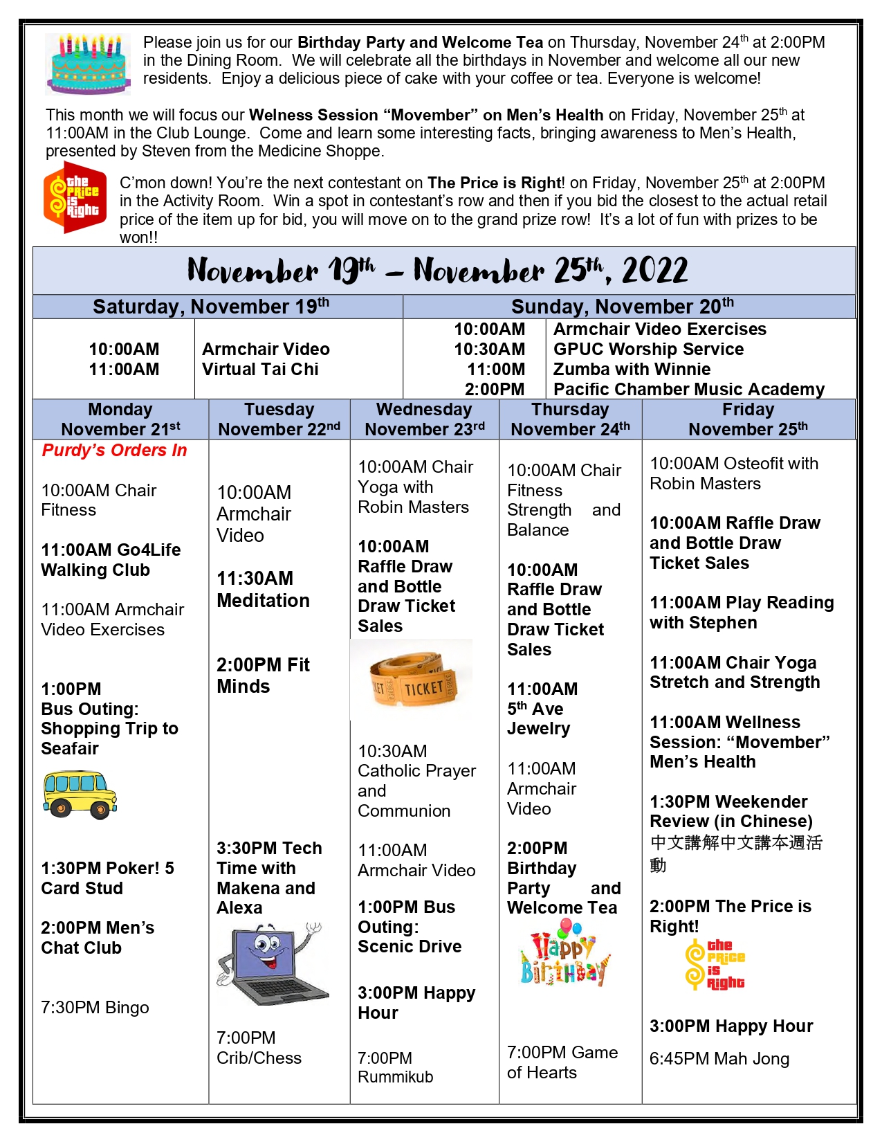 Come join us for our events for this week from November 19th – 25th. It includes birthdays, prizes, raffles, fun events and wellness. See you soon!