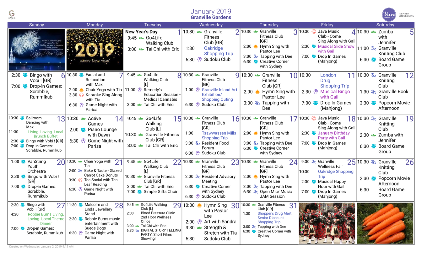 Granville Gardens January 2019 Calendar