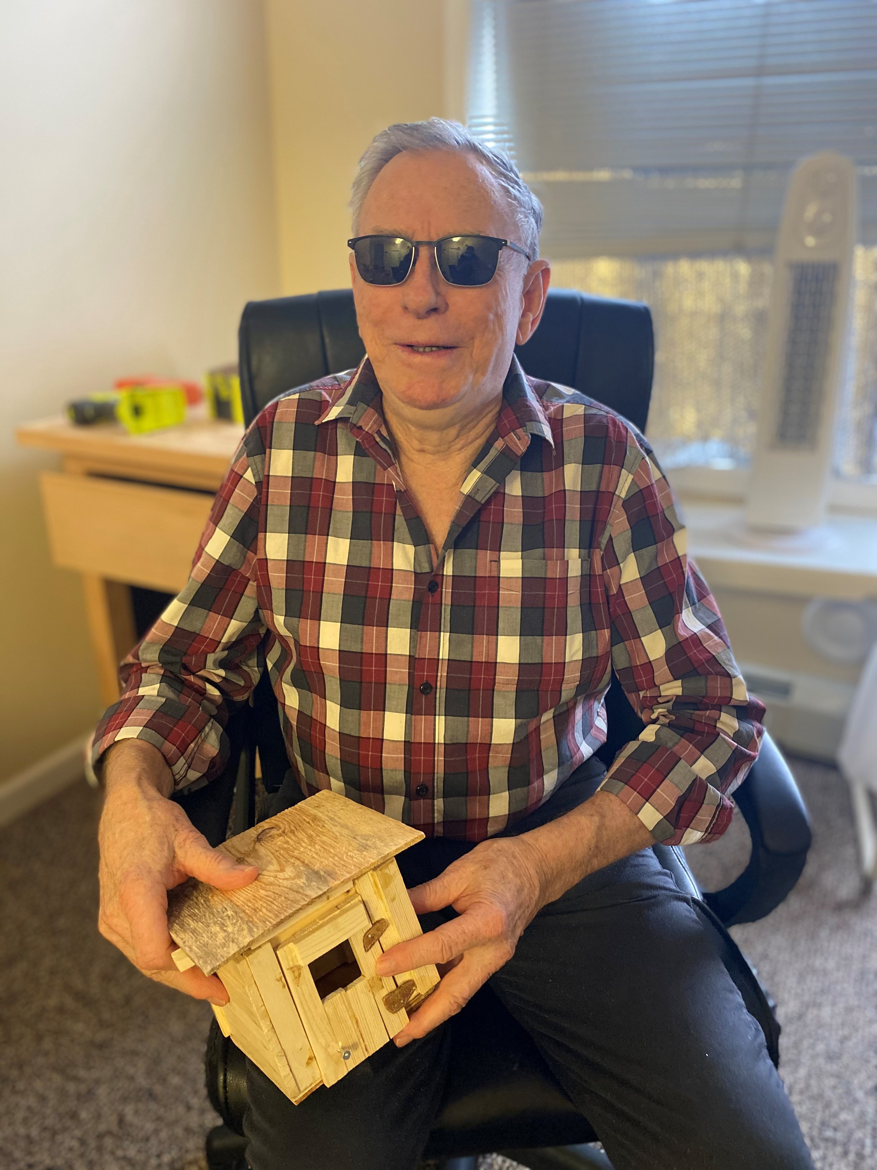For Dave, that was not enough. He needed to find something that gave his purpose back. It started small. He decided he would edge the side of his table. He phoned Windsor Plywood in Lloydminster and got them to cut the pieces he needed. He figured out that from memory, even in the dark, he could still use a hammer and nail. Dave then decided that if he had the right tools, he could create bird houses. He had the idea to stack the wood. He had a friend cut a piece of wood for him that he used as a guide. He has a small ‘shop’ set up in his room and from memory, he has been able to create small bird houses! He has plans to one day sell them and donate funds to CNIB. Dave says he feels as if he has purpose again and he is sure inspiring the rest of us!