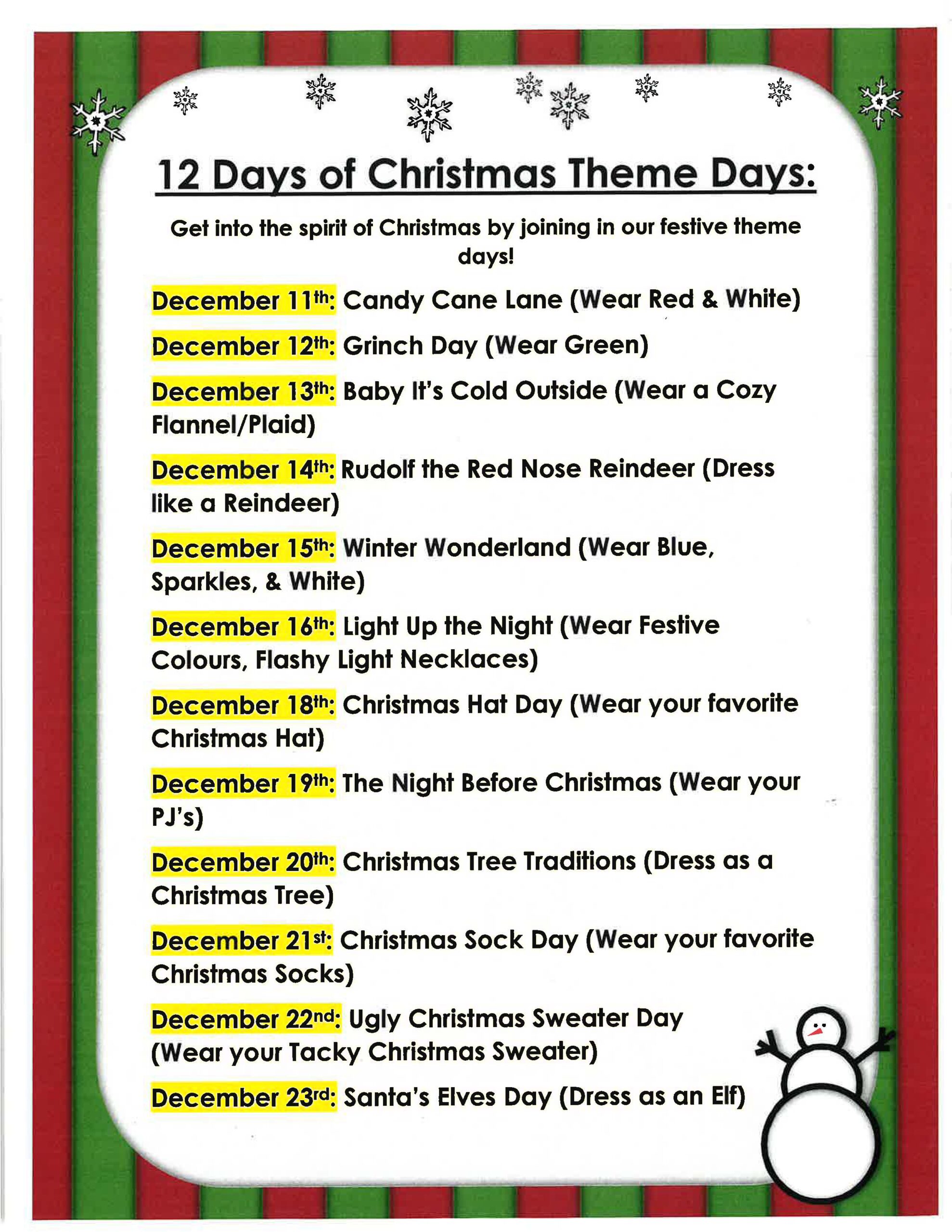 Get into the spirit of Christmas by Joins in our festive theme days! If anyone outside Palermo wants to participate please contact us 905-582-0395!