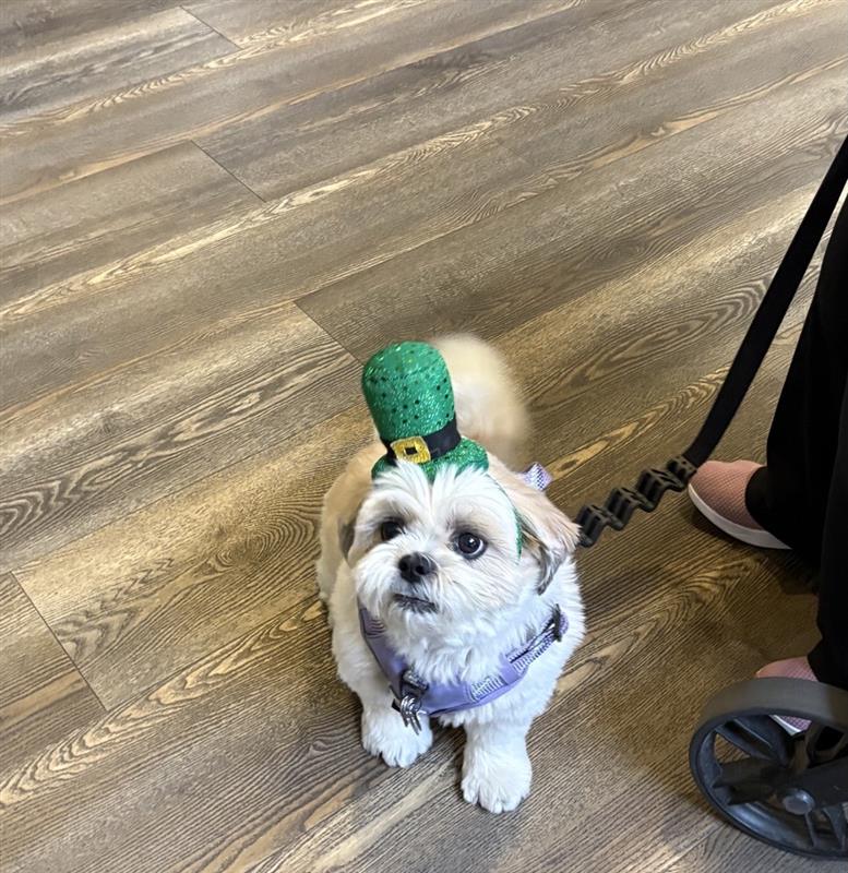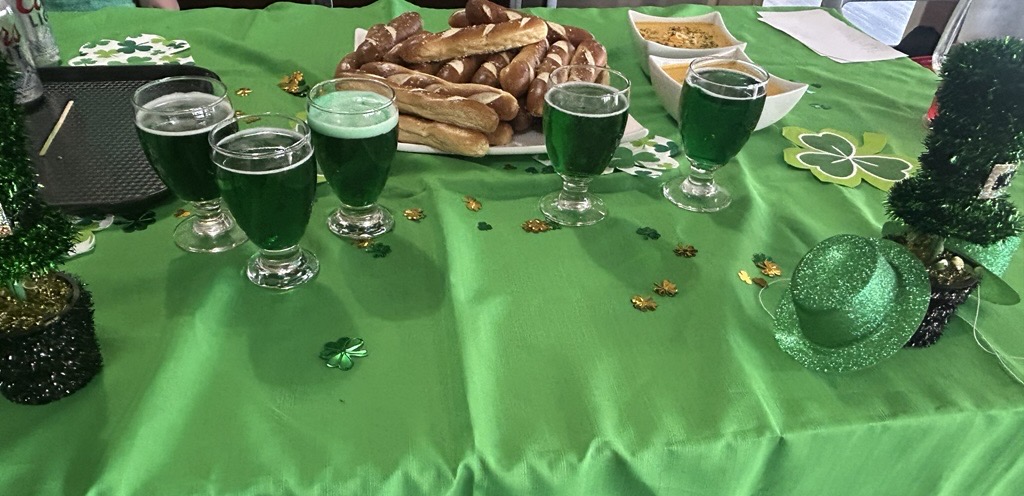We celebrated St. Patrick’s Day at our home with beer and pretzels! Everyone had a great time enjoying the festive spirit. The funniest part—one of our resident’s dogs joined in the celebration too by wearing a green band! It was absolutely adorable.