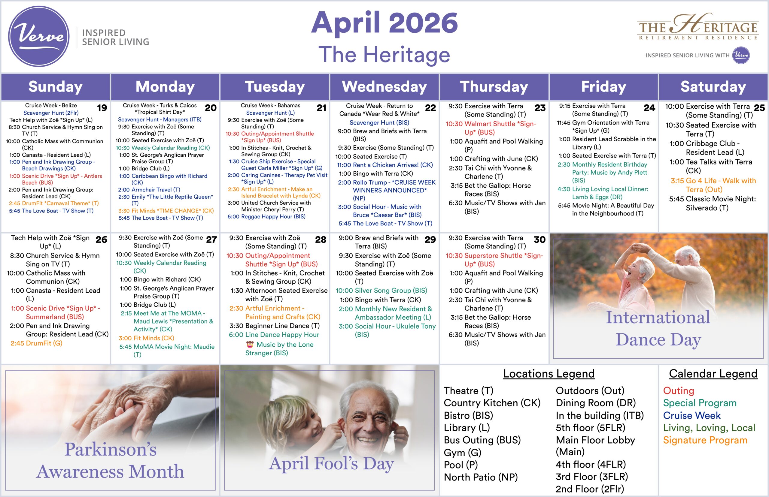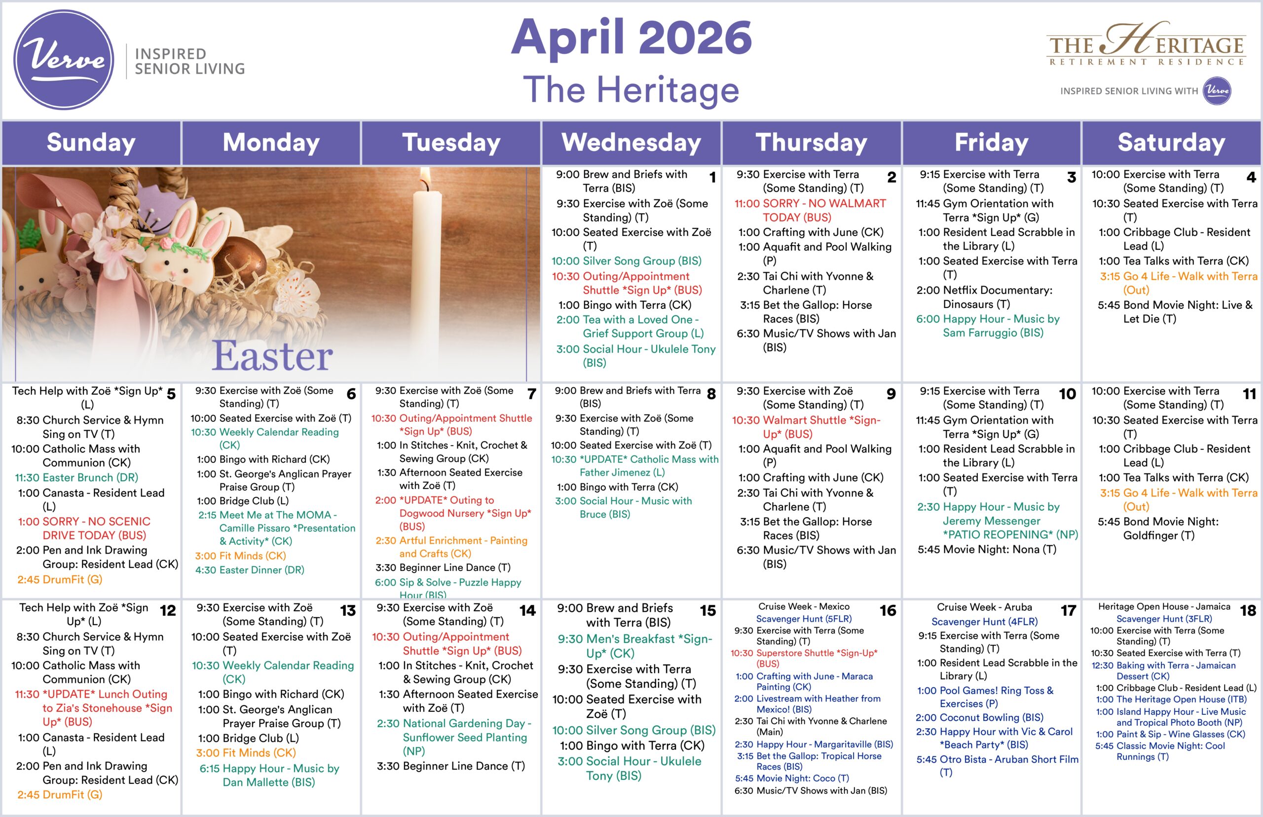From Easter celebrations and outings to Dogwood Nursery, to live music, fitness classes, and creative programs, there’s something for everyone to enjoy. Don’t miss our Caribbean Cruise Week from April 16–22, featuring themed activities, entertainment, and our Open House on April 18.