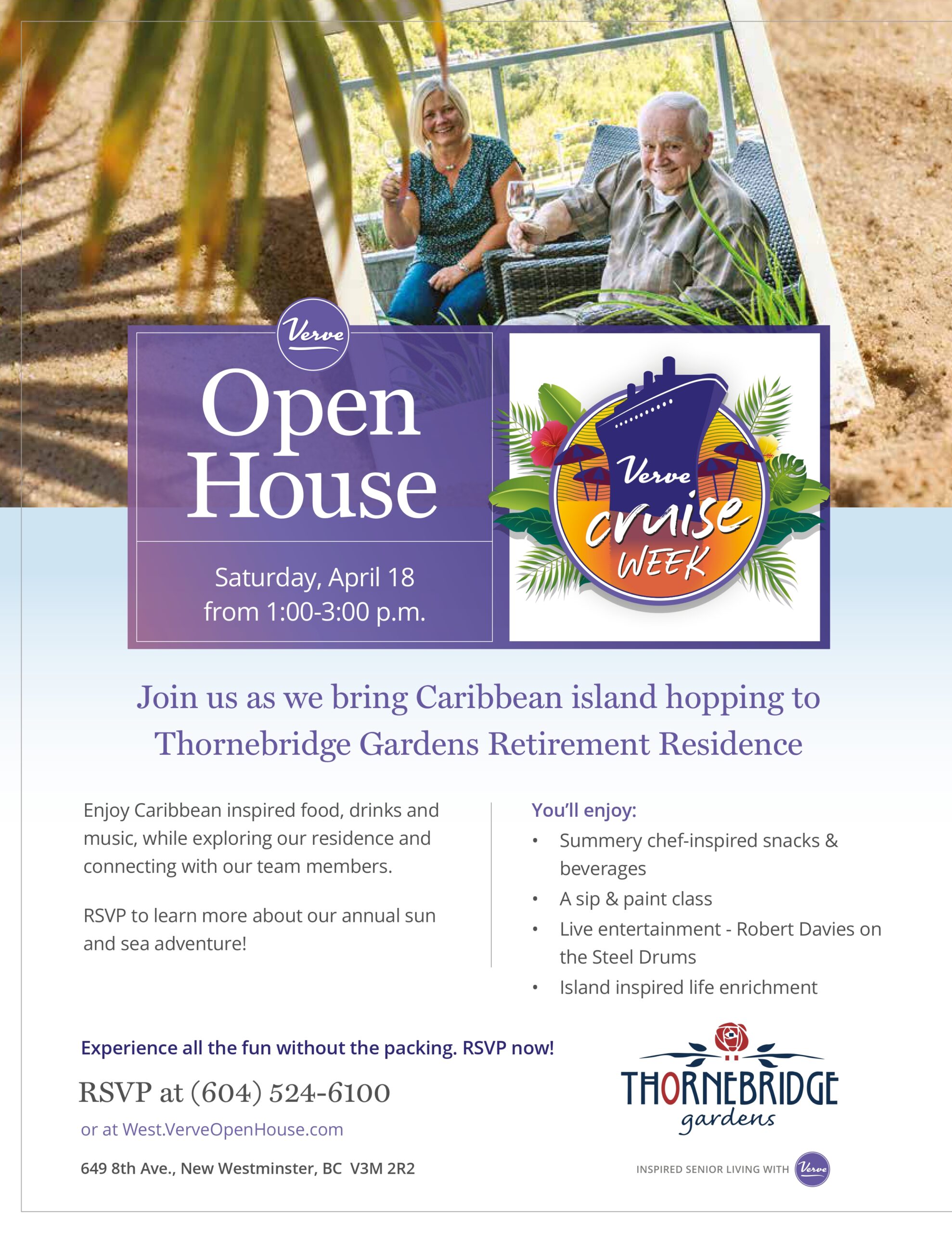 Join us as we bring Caribbean island hopping to Thornebridge Gardens Retirement Residence on Saturday, April 18th. Please RSVP at (604) 5246100 to learn more about our annual sun and sea adventure!