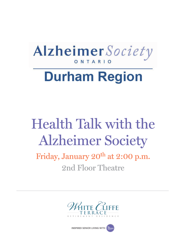 Join us for our Health Talk with the Alzheimer Society on Friday, January 20th at 2:00pm on the 2nd Floor.