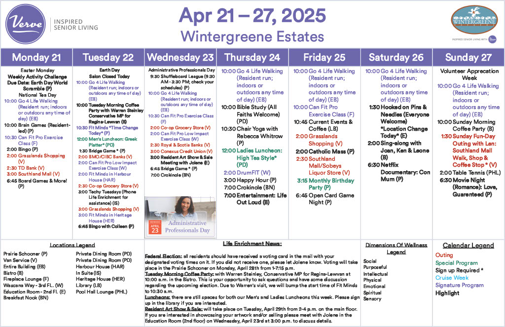 April 2025 – Weekly Activity Calendar for Apr 21 – 27